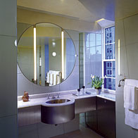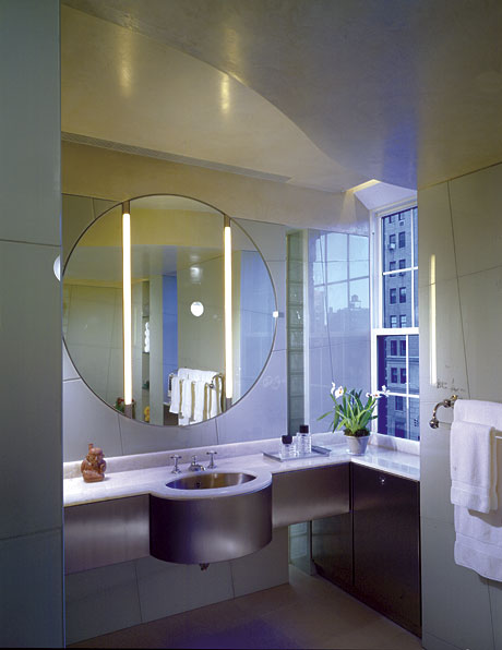 New York, NY This project represents the transformation of a traditional 2,300 square foot Manhattan apartment into a spatially complex modern loft. Assymetrical interventions create dynamic spatial tensions that counterpoint the original structure and frame. The apartment includes living, formal dining, eat-in kitchen, study, library, and a master bedroom suite with two dressing rooms, two bathrooms and a laundry. Continue BackThe limestone floor, cabinets and bathroom walls are rotated from the orthogonal plan, reinforcing the object/frame strategy. The cabinets that enclose the study and the dressing rooms are capped with glass clerestory windows and float below the ceiling, ensuring privacy while maintaining spatial continuity.