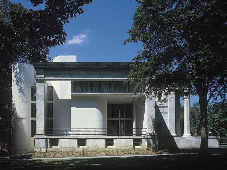 Whig Hall Princeton, NJ At the heart of Princeton’s campus lies Canon Green, bounded on the south by a pair of identical neoclassical structures built to house the University’s two debating societies, Whig and Clio. When all but the exterior wall of Whig was destroyed by fire, the University took the rebuilding program as an opportunity to strengthen ties of its formal center to current student use. Continue BackFurther, new construction had to be built to current building—particularly fireproofing—codes and be fitted with a modern air conditioning system. The new facility is structurally and aesthetically independent from the shell of the original building within which it sits. To avoid overburdening old walls and foundations, new full height columns were lowered on to newly created foundations within the old building’s perimeter. By removing the east wall, the structure and the activity held within are visible to students along the busy cross campus path to the east.