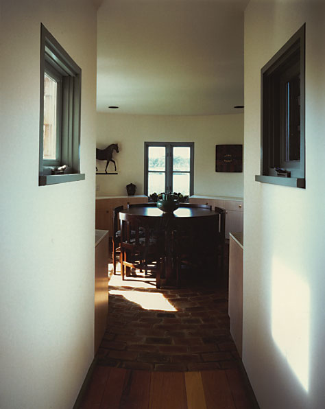 East Hampton, NY The Spielberg residence is located on the edge of a saltwater pond on a six-acre field in East Hampton, New York. The owners’ desire for a house that peacefully coexisted with the landscape and a home scaled for comfort and privacy, harmonized with local restrictions on the development of the pond’s shoreline. The challenge was to design a structure that retained the feeling of summer bungalows and the converted farms of the area, without becoming an imitation “old house.” Continue BackBoth architecture and landscape are revealed as a series of fragments, beginning with arrival in the autocourt, which affords a glimpse of the pond, and culminating in expansive views of the dunes and the ocean from the upstairs windows. A carriage house screens the main building from the autocourt and forms the gate to a pear-tree courtyard whose dimensions echo the footprint of the barn. The main axis of arrival leads to a shingled entrance porch; a cross-axial path leads west to the swimming pool terrace overlooking the pond.