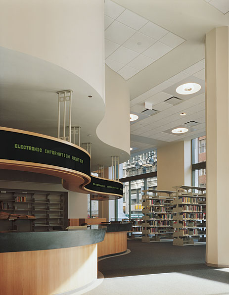 The Graduate Center, Mina S. Rees Library New York, NY The new Graduate Center is a vertical complex organized on twelve levels of the former B. Altman's Department Store in midtown Manhattan. The challenges of the 580,000-square-foot renovation included not only the updating of a nearly 100-year-old building, but the design of a wide variety of educational and cultural facilities including the new library, which is at the intellectual heart of the campus. Continue BackThe library also offers group study areas, miscellaneous special collection rooms, dissertation archives and a media library complete with music listening stations. In its previous quarters, the library was in the basement. Now library users have the luxury of sitting next to 12-foot-high windows that look out onto Fifth Avenue, Madison Avenue, and 35th Street.